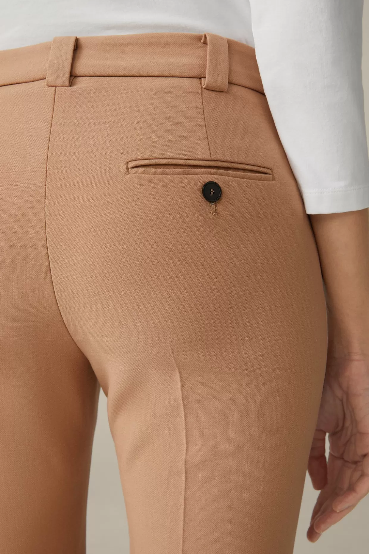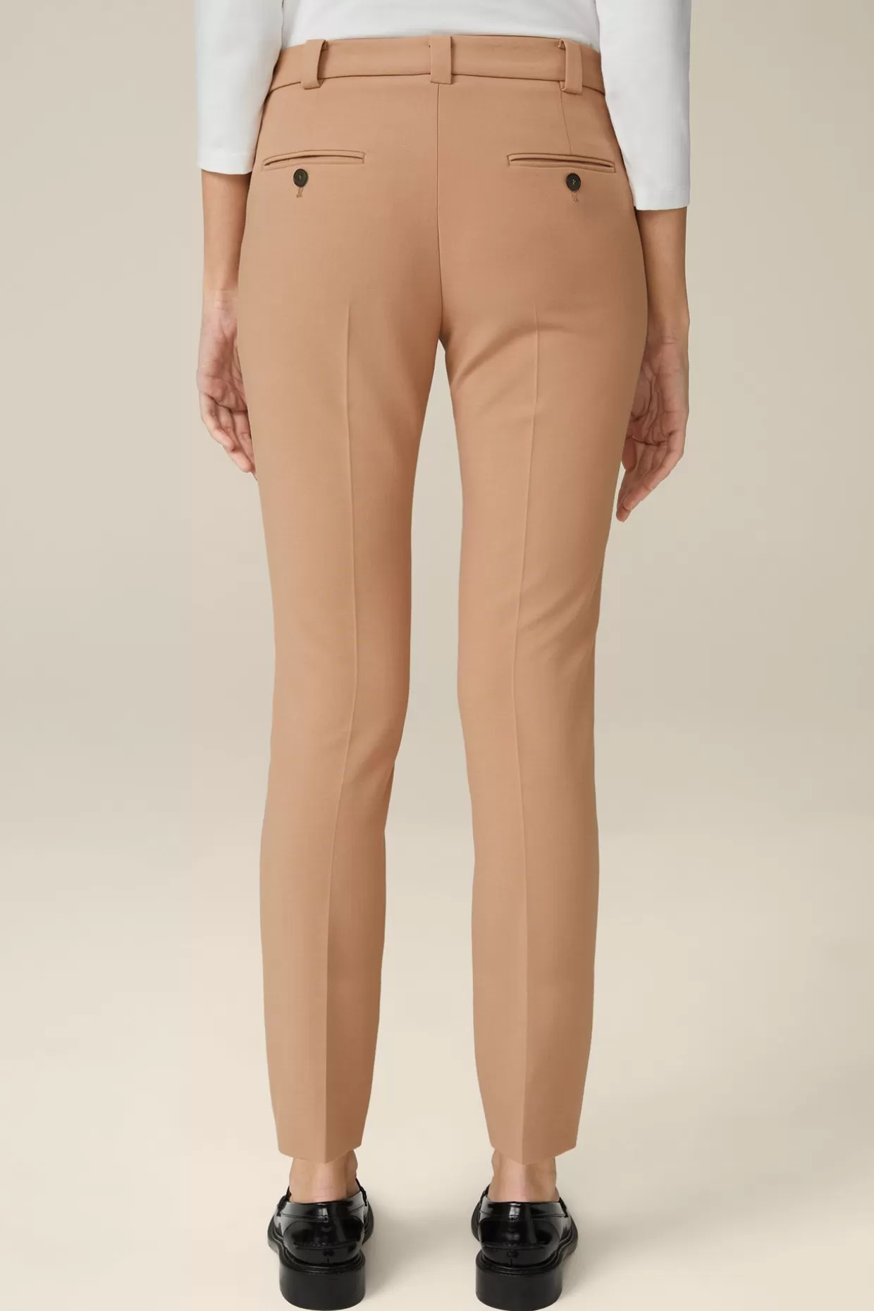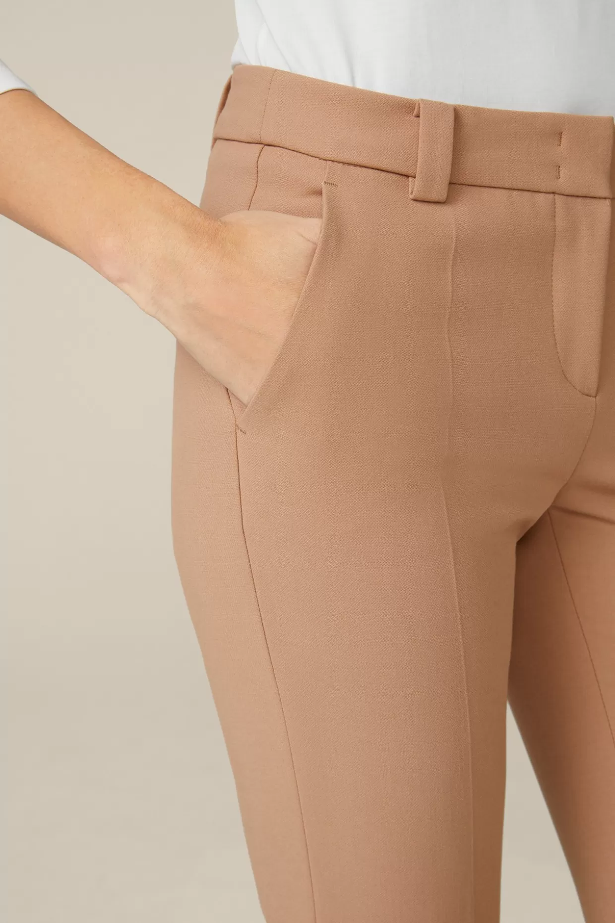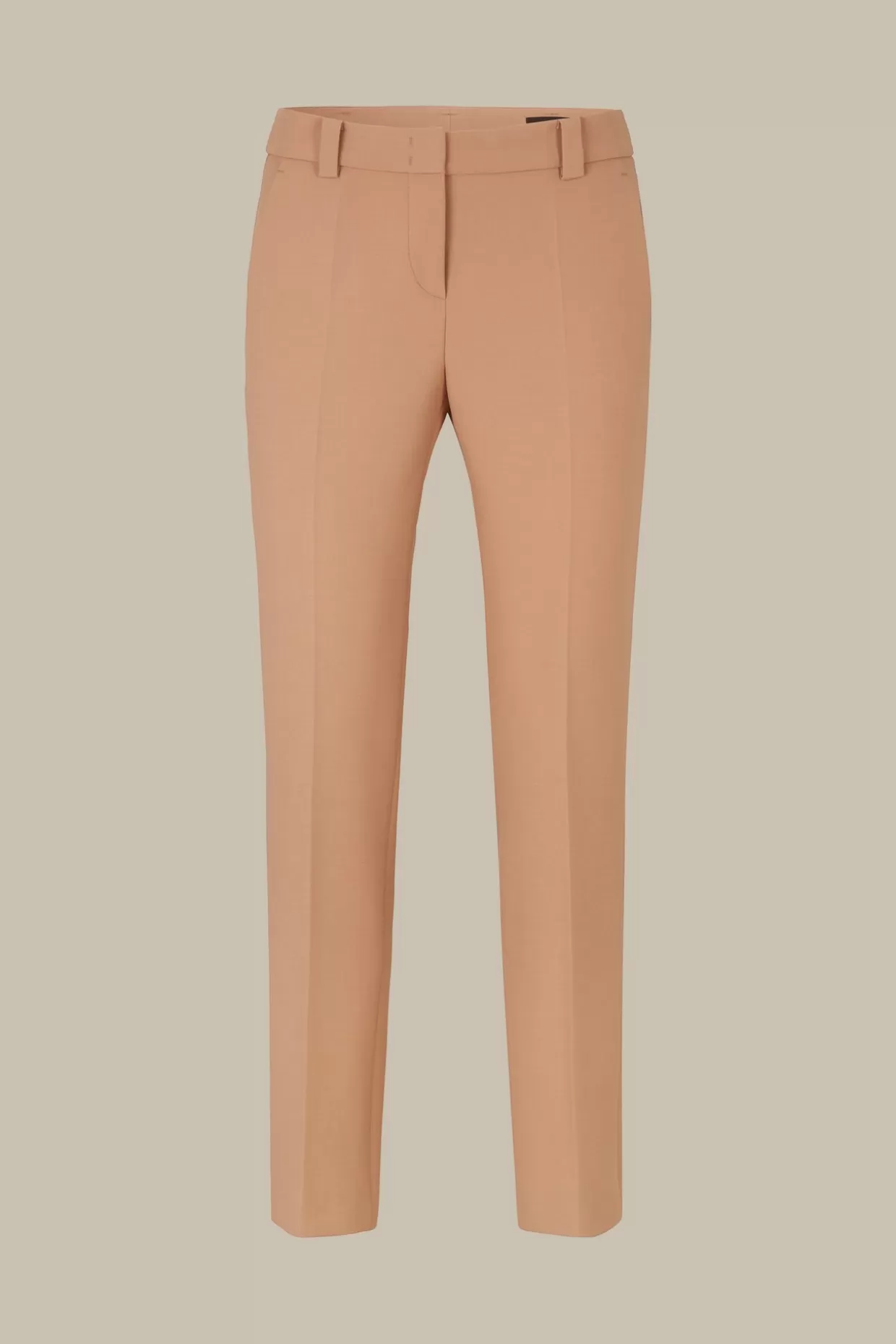 Die Modern Verkürzte Anzughose In Camel Aus Dem Hause Windsor Begeistert Aus Soft Dopio Crêpe Im Viskose-Blend Als Classic-Allrounder. Knöpfbare Paspelgesäßtaschen Und Bügelfalten Akzentuieren Die Schmale Silhouette. Für Einen Lässigen Twist Sorgen Breitere Gürtelschlaufen Am Bund Sowie Die Verdeckte Schließe Mit Zipper Und Duo-Haken. Der Look Wirkt Souverän Als Monochromer Damen-Suit Mit Dem Passenden Blazer.
