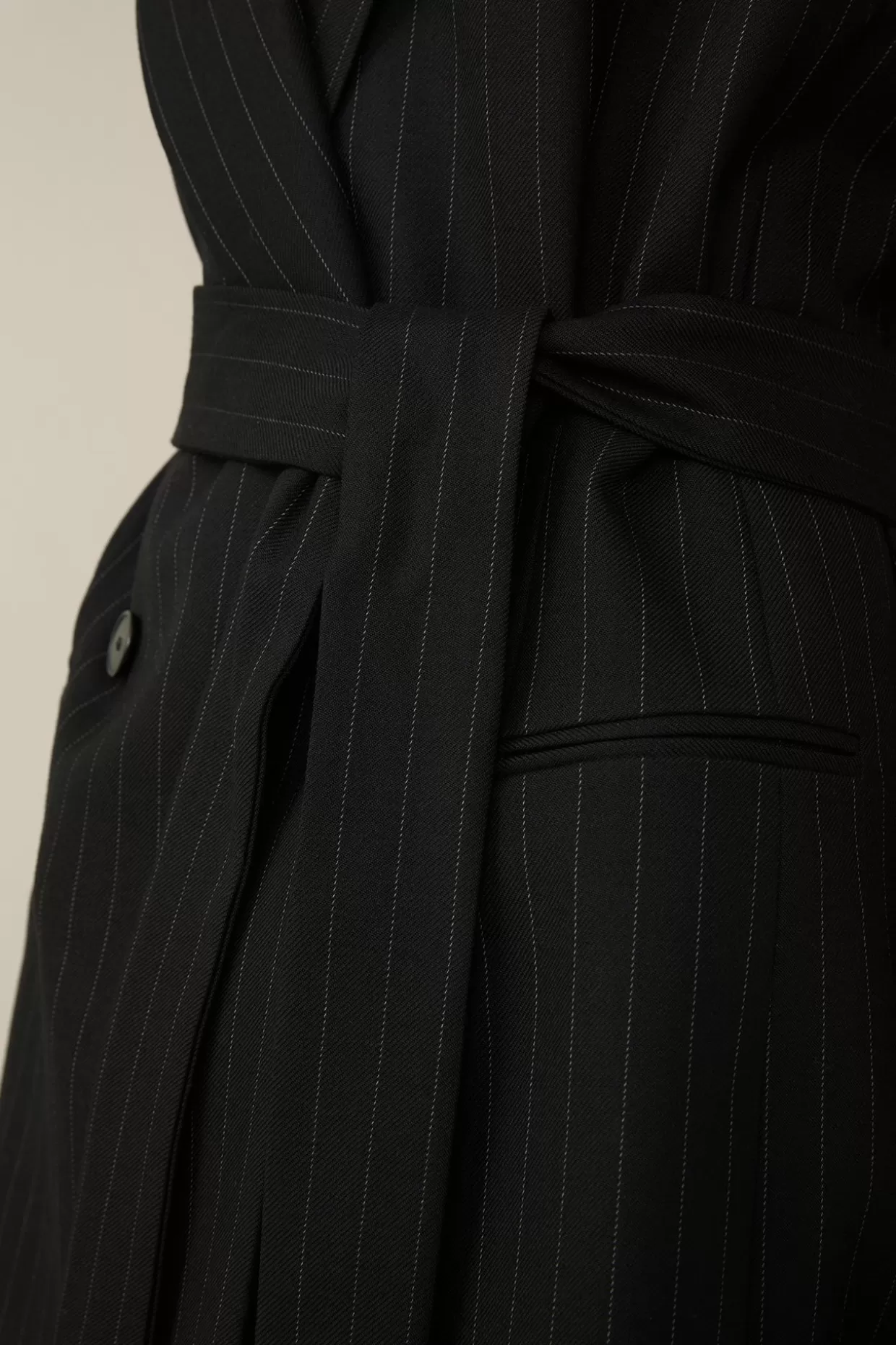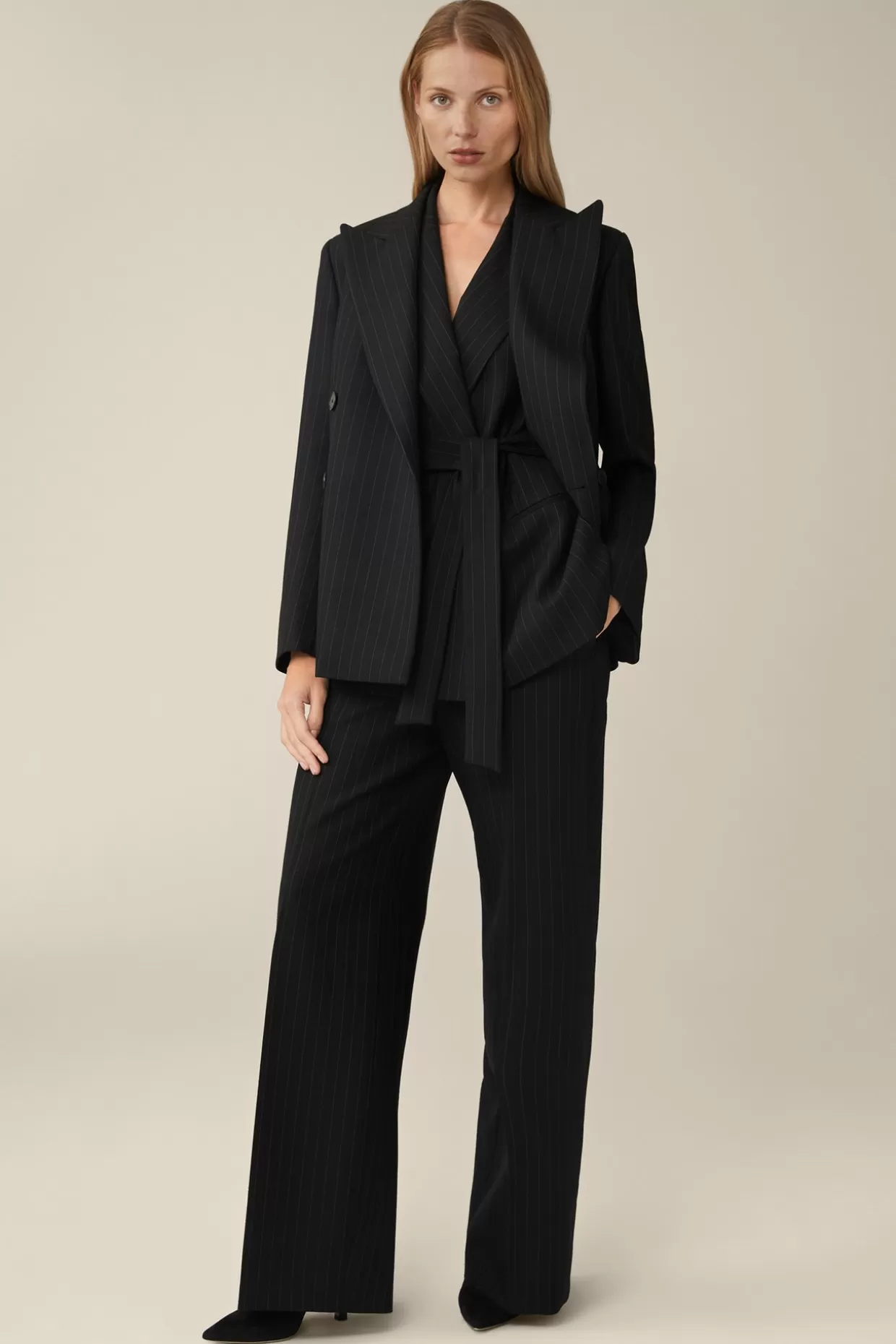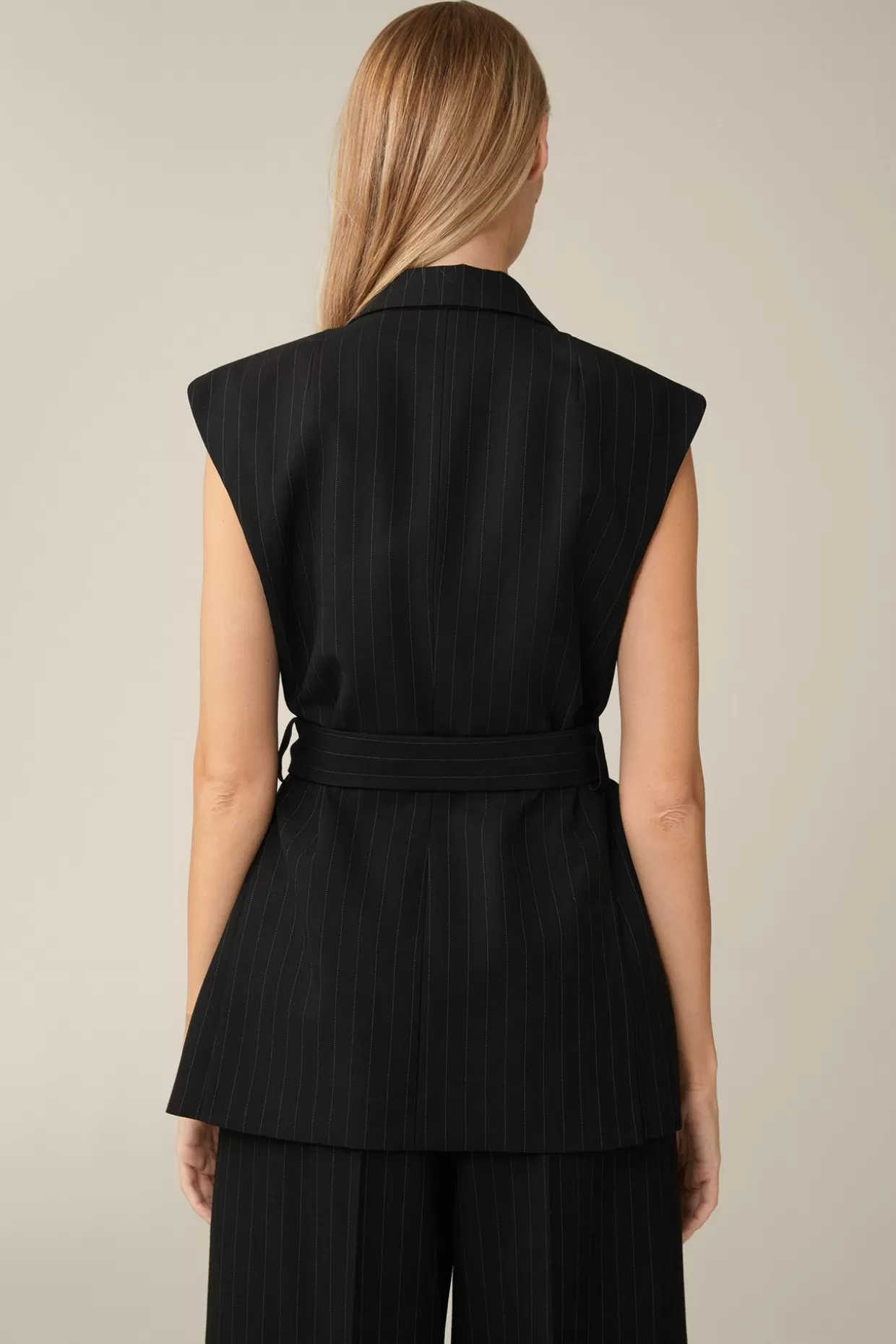 Im Stilvollen Nadelstreifen-Look Mit Reverskragen Erweist Sich Die Lange Doppelreiher-Weste In Schwarz Als Vielseitiges Stylingpiece – Klassisch In Kombination Mit Dem Dazugehörigen Blazer Und Marlenehose. Reine Schurwolle Und Ein Fließendes Futter Schenken Angenehmen Tragekomfort, Ergänzt Durch Bewegungsschlitze, Während Der Bindegürtel Ein Raffiniertes Finish Bietet.